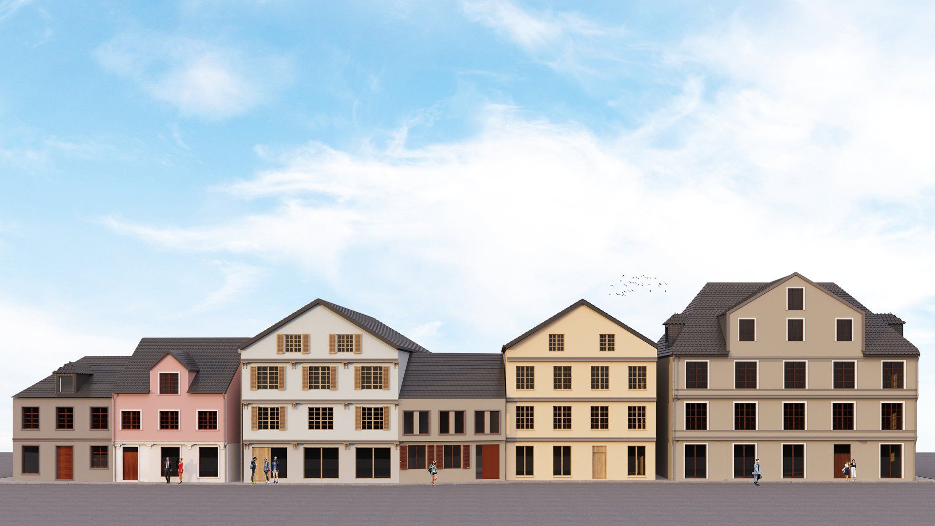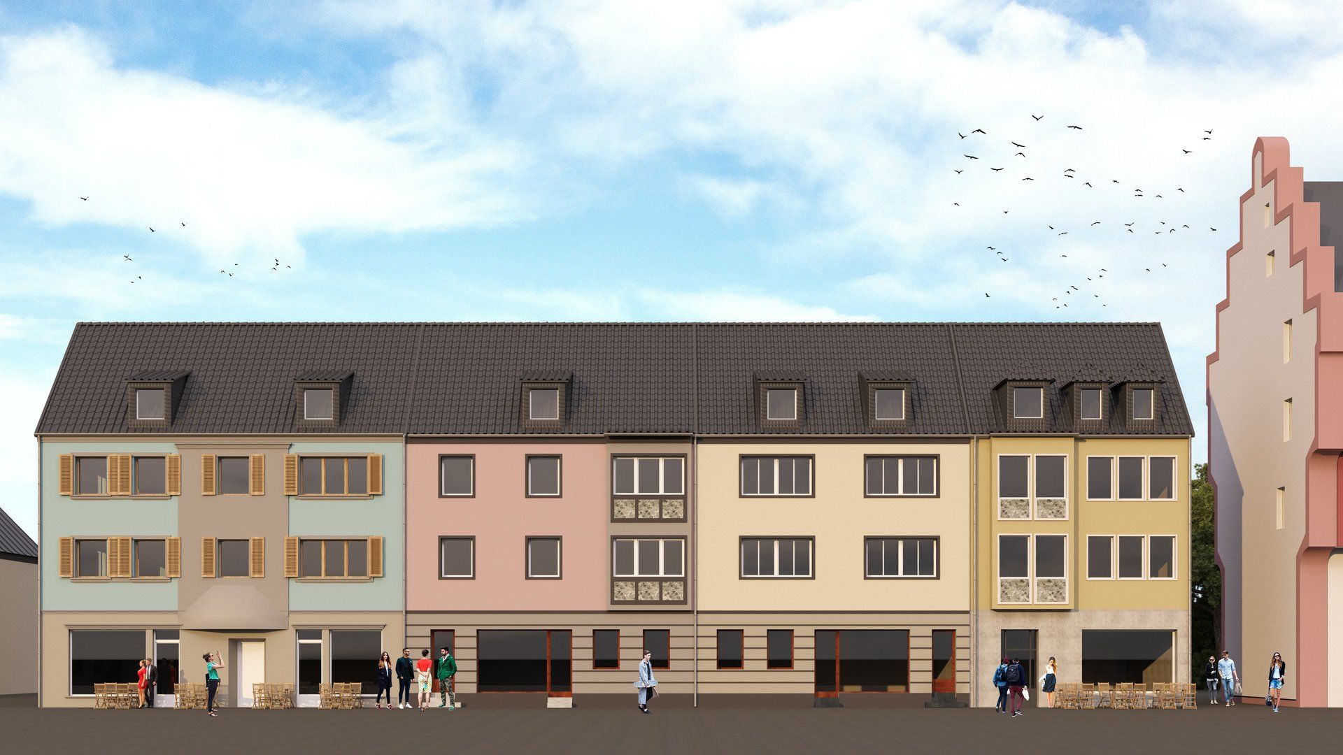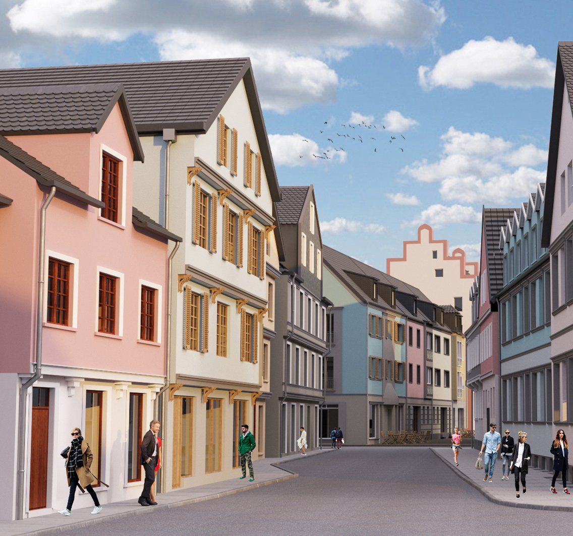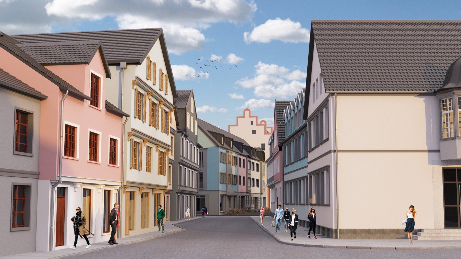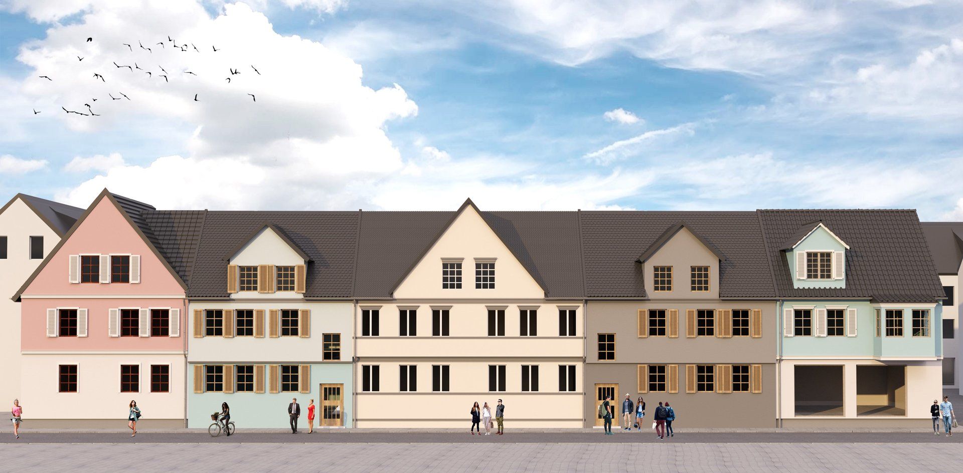Die abgewohnten Gebäude der 1950er Jahren können alternativ zur Fassadengestaltung ersetzt werden. In regionaltypischer Bauweise entstehen die Gebäude so, dass der Gesamteindruck der früheren Altstadtbebauung ähnelt.